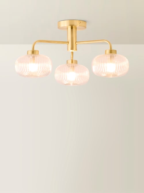 Brighten up your bathroom with the Amaia 3-way semi flush ceiling light in bright and shiny gold with clear ribbed glass shades. This modern trio brings instant style, casting a warm, atmospheric glow that feels both polished and calming. With its IP44 rating, it’s built to handle everyday splashes, so it looks good and works hard too. A simple way to give your bathroom a fresh, contemporary lift. Requires three 3W LED G9 bulbs.
