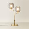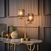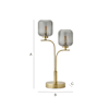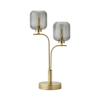- Two way table lamp with a brushed gold metal finish and ribbed smoked glass globe shades for double the glow.