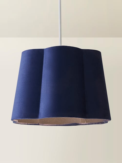 Voluptuous, velvety and very on trend, the navy Amy scalloped lightshade has a sumptuous tactile finish. The velvet fabric is available in 3 contemporary colours a blush pink, forest green, and grey. With a nod to art deco design, the rich texture and colours work well in homes with a vintage vibe, or modern rooms with selected 1920s inspired pieces. A scalloped design ceiling pendant shade finished in a beautiful, on trend velvet fabric. Our shades come with a 4cm opening for E27 lamp holders, and we’ve added a handy reducer ring that brings it down to 3cm so it’s E14 friendly too.