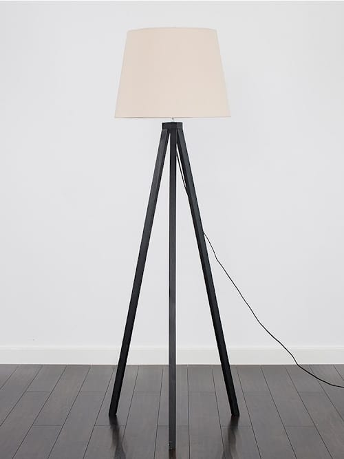 Barbro Black Wood Tripod Floor Lamp with Large Beige Tapered Shade