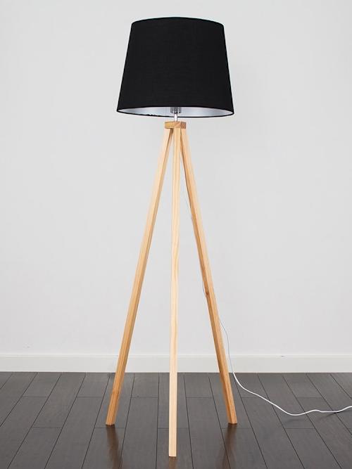 Barbro Light Wood Tripod Floor Lamp with Large Black Tapered Shade