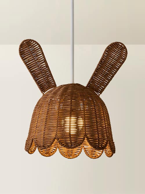 Meet Bella, the bunny-shaped rattan shade that's here to hop into your heart! With her super cute ears, scalloped edge and cosy woven texture, she's the perfect way to add a touch of whimsy to your space. Bella doesn't just light up a room, she brings a little hop, skip, and jump of fun too! Whether you're looking for a quirky addition to your nursery or a playful touch to any room, Bella's ready to add some cheeky charm and brighten your day, one bunny-ear at a time. Our shades come with a 4cm opening for E27 lamp holders, and we’ve added a handy reducer ring that brings it down to 3cm so it’s E14 friendly too.