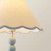 - A powder blue bobbin floor lamp base, topped off with a blue trim scallop linen lamp shade for a mix and match pastel feel.