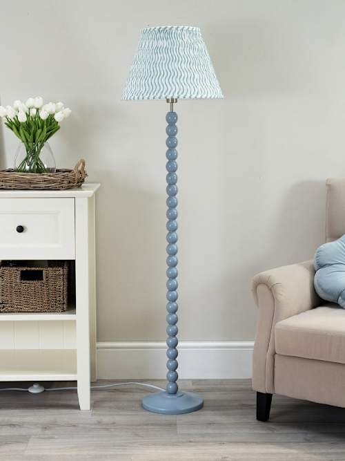 The birdie bobbin floor lamp in powder blue is the best way to add a little sweetness to your style. Soften up your interiors with a style so versatile you could have one in every room from the nursery to the dining room. Matched with a green wave shade. A stand alone wooden floor lamp base in a stacked bobbin style with a standard e27 cap type and foot switch, topped with a pink aztec fabric shade. A powder blue bobbin floor lamp base, topped off with a green wave fabric lamp shade for a mix and match feel. Add a pastel touch to any room, tie together an existing colour scheme or a pop of colour to a neutral space. Suitable for nurseries, bedrooms, living rooms or home offices. Requires 1 x