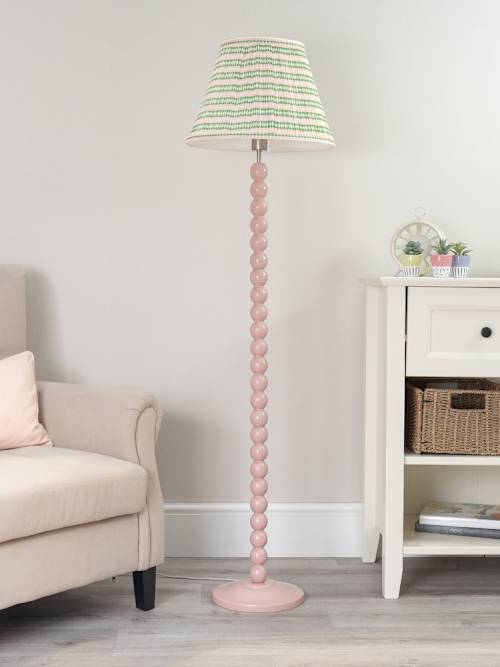The birdie bobbin floor lamp in rose pink is the best way to add a little sweetness to your style. Soften up your interiors with a style so versatile you could have one in every room from the nursery to the dining room. Matched with a pink aztec shade. A stand alone wooden floor lamp base in a stacked bobbin style with a standard e27 cap type and foot switch. Topped off with a pink aztec fabric shade. A rose pink bobbin floor lamp base, topped off with a pink aztec fabric lamp shade for a fun and funky feel. Add a pastel touch to any room, tie together an existing colour scheme or a pop of colour to a neutral space. Suitable for nurseries, bedrooms, living rooms or home offices. Requires 1 x