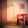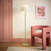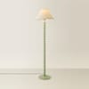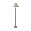 - A sage green bobbin floor lamp base, topped off with a green trim scallop linen lamp shade for a monochromatic pastel feel.