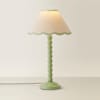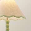 - A sage green bobbin table lamp base, topped off with a green trim scalloped linen shade for a mix and match pastel feel.