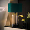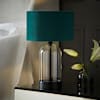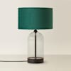 The black and clear glass table lamp with small velvet Reni shade in forest green is a versatile table lamp that can amp up several interior styles. Reni shades can be switched out for different colours and materials to suit any season, style change or room.