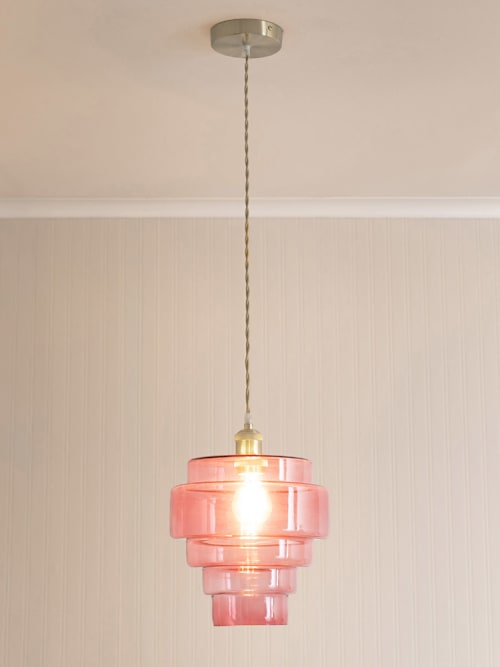 Give your home a style boost with this brushed chrome lamp holder ceiling light, paired with the Lane 5 tier pink glass shade. The glow from the tiered pink glass sets the perfect vibe, while the brushed chrome adds a modern feel. Whether you're hosting a dinner party or relaxing with a cuppa, this light effortlessly elevates your space. Ideal for kitchens, dining rooms, or anywhere you need a little extra sparkle. Warning: may cause envy from friends and family!