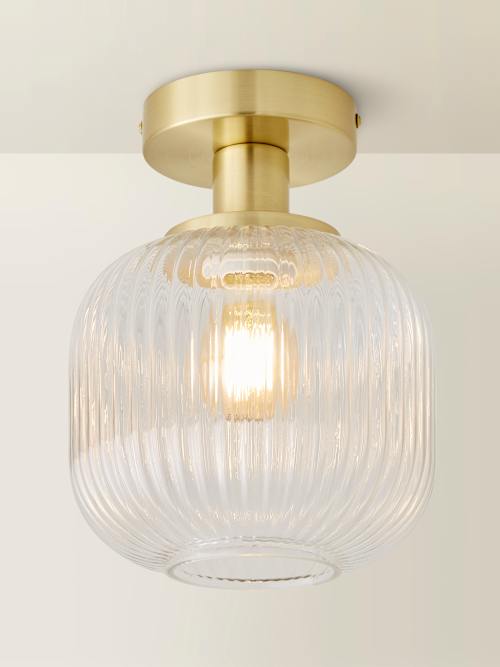 The calpe clear glass flush ceiling light is a subtle nod to the art deco style with a modern twist. Perfect for rooms with low ceilings, this flush ceiling light stays out of the way without getting lost. The shade is the star of this show, a large clear glass ribbed shade on a brushed gold ceiling plate and body. Clear ribbed glass shade with brushed gold body in a flush ceiling light design to create a focal point to any room without losing any head room. Bring that art deco feel into your living room, kitchen, bedroom or hallway with an understated but oh so chic flush ceiling light. Requires 1x e27 bulb, max 1w. Personalise the lighting with your choice of warm, cool or smart bulbs.