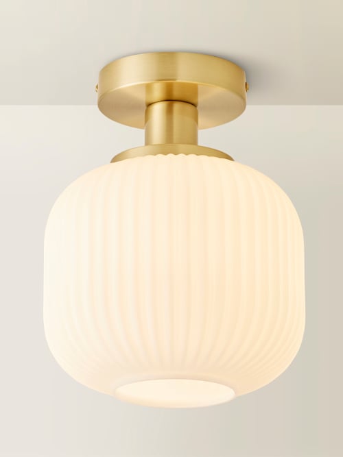 The calpe opal glass flush ceiling light is a subtle nod to the art deco style with a modern twist. Perfect for rooms with low ceilings, this flush ceiling light stays out of the way without getting lost. The shade is the star of this show, a large opal glass ribbed shade on a brushed gold ceiling plate and body. Opal ribbed glass shade with brushed gold body in a flush ceiling light design to create a focal point to any room without losing any head room. Bring that art deco feel into your living room, kitchen, bedroom or hallway with an understated but oh so chic flush ceiling light. Requires 1x e27 bulb, max 1w. Personalise the lighting with your choice of warm, cool or smart bulbs.