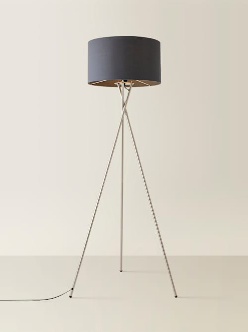 The Camden brushed chrome tripod floor lamp is a stylish little number that works wonders in any contemporary interior. The long sleek crossed metal legs make a subtle, yet impactful, statement, paired with the large charcoal lamp shade to really pack a style punch! Long legs and a standout shade make this floor lamp look like it's ready to walk the runway. Great for lighting up living rooms and de-glooming dreary corners, it also comes with a handy foot switch so it's user (and back!) friendly.