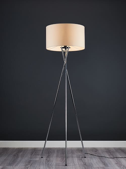 The Camden chrome tripod floor lamp is a stylish little number that works wonders in any contemporary interior. The long sleek crossed metal legs make a subtle, yet impactful, statement, paired with the large mink lamp shade to really pack a style punch! Long legs and a standout shade make this floor lamp look like it's ready to walk the runway. Great for lighting up living rooms and de-glooming dreary corners, it also comes with a handy foot switch so it's user (and back!) friendly.