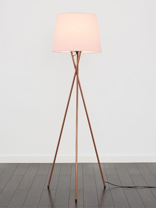 The Camden copper tripod floor lamp is a stylish little number that works wonders in any contemporary interior. The long sleek crossed metal legs make a subtle, yet impactful, statement, paired with the large pink tapered lamp shade to really pack a style punch! Long legs and a standout shade make this floor lamp look like it’s ready to walk the runway. Great for lighting up living rooms and de-glooming dreary corners, it also comes with a handy foot switch so it’s user (and back!) friendly.