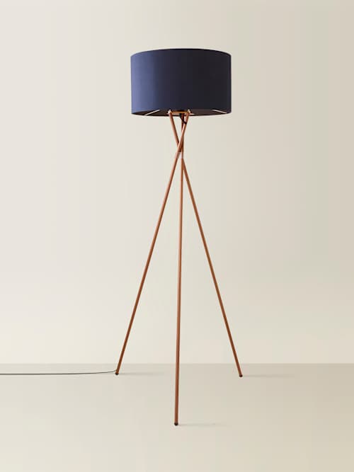 The Camden copper tripod floor lamp is a stylish little number that works wonders in any contemporary interior. The long sleek crossed metal legs make a subtle, yet impactful, statement, paired with the large blue lamp shade to really pack a style punch! Long legs and a standout shade make this floor lamp look like it's ready to walk the runway. Great for lighting up living rooms and de-glooming dreary corners, it also comes with a handy foot switch so it's user (and back!) friendly.