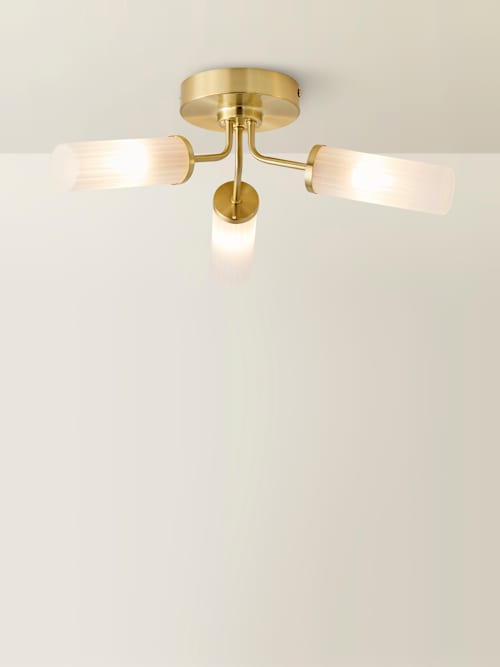 Light up your bathroom with the stylish Canya IP44 gold 3 way ceiling light with reeded glass shades.
