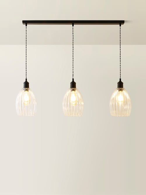 The Cheltenham 3 drop diner ceiling light is made to impress. Three ribbed glass domes hang gracefully in a row, scattering a soft, textured glow that feels effortlessly chic. Finished in matte black for that luxe touch, it’s a statement piece that shines brightest above dining tables, kitchen islands or breakfast bars. Stylish and practical in equal measure, it brings elegance and atmosphere to every mealtime. For a coordinated look, explore other matching lights in the Cheltenham family.