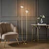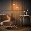 <p>The Chessy asymmetric ribbed glass globe floor lamp is an understated way to bring a little bit of art deco glamour into many different areas of your home. The yellow ribbed glass detail adds a textural interest and a subtle hint of colour, with a warm glow for those areas you want to make relaxing.The asymmetrical design catches the eye but the ribbed glass shades and gold finish are what grabs attention. The perfect addition to any layered lighting scheme. </p><ul><li>Two way free standing floor lamp with a brushed gold metal finish and ribbed glass globe shades in amber. </li><li>Beautiful amber glass ribbed globe shades and brushed gold finish, a touch of art deco glamour for a modern home.</li><li>Add an elegant glow to any room. Bring together the gold finishes in your living room, hallway or bedroom with a soft, ribbed glass touch, yellow glow and art deco nod. </li><li>Requires 2 x G9 bulb, max 10W. Personalise your home lighting with your choice of warm or cool bulbs.</li><