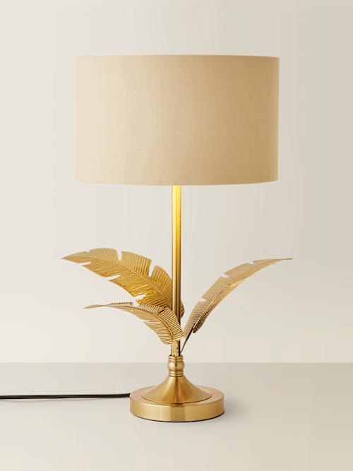 Christina is the table lamp that adds a healthy dose of tropical luxury to your space. Featuring a stunning gold leaf design at the top, it brings elegance with a hint of jungle charm. Paired with a beige shade and a shiny gold inner, this lamp is a perfect fusion of opulence and nature-inspired style. Christina's unique look and luxurious finish will brighten your room with flair. Ready to leaf a lasting impression? Christina's your golden girl!