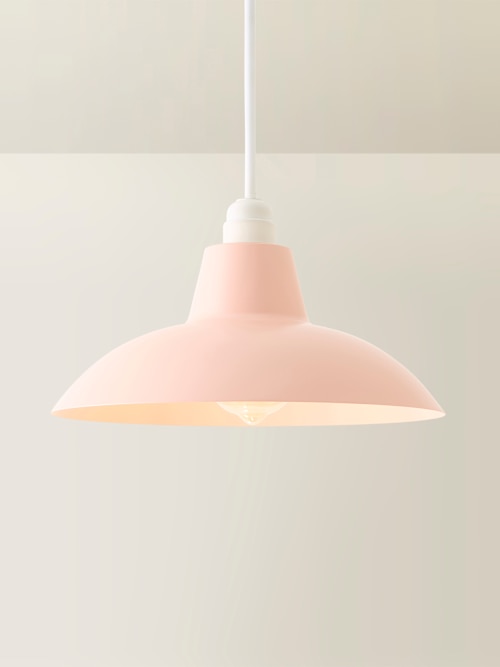 Civic Blush Pink Metal Pendant Shade. A retro shade for the majority of ceiling fittings. Great for a hallway or above a dining room table. Requires one 4W BC/B22 bulb or LED equivalent. Our shades come with a 4cm opening for E27 lamp holders, and we’ve added a handy reducer ring that brings it down to 3cm so it’s E14 friendly too.