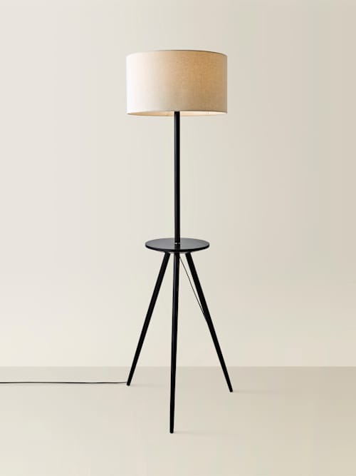 Desmond is a diamond of home décor, a treasure of taste, and a style staple in interiors. The base of the tripod floor lamp has a handy integrated table, making Desmond a multitasking marvel and the perfect place to rest your brew, or maybe something more decorative. If you fancy it. Topped with a natural colour drum shade that gives off a warm and cosy glow when lit, this wooden floor lamp suits a range of styles from cottagecore to contemporary minimalist and is available in both light and black wood finishes.