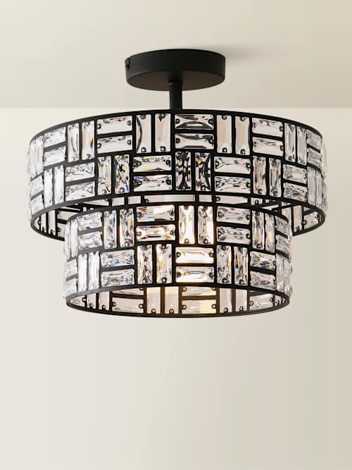 The elise pendant ceiling light in black is all glitz and glamour, ready to add elegance to any space. Plus, it's got all the sophistication of a chandelier without taking up so much precious headroom. Win win! A flush style pendant ceiling light with two tiers of acrylic panels and a black finished metal base. A tiered design gives this flush ceiling light in black a glamorous feel and beautiful lighting effect. A dazzling addition to any kitchen, living room, bedroom, hallway or home office. The flush design makes it ideal for rooms with lower ceilings too. Requires 1 x e27 bulb, max 1w. Personalise the lighting with your choice of warm, cool and smart bulb.a a requires installation and