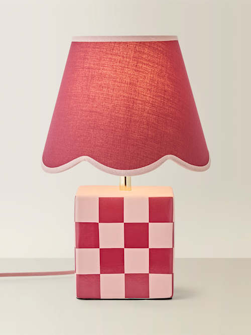 The Evie burgundy table lamp shows just how much impact colour can have. With its glossy checkerboard ceramic base and playful scalloped shade, Evie brings instant charm and warmth to any space. Burgundy is one of the season’s most on-trend hues, making this lamp an easy way to weave rich, bold colour into your home. Place Evie on a bedside, side table or console to enjoy soft, inviting light with a stylish twist. Pair it with the sage green version for a mix-and-match look that feels effortlessly modern.