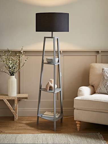 Painted black wood-effect floor lamps are another popular design, if the black and gold combo isn’t for you. A black wood effect floor lamp is another elevated basic, adding interest through texture in a cool, understated way. Plastic black floor lamps are an affordable and lightweight option, ideal for situations that are short term and restricted by a tighter budget- we see you, students.