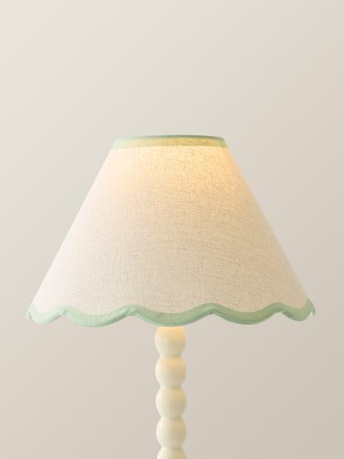 The florie small scallop shade with green trim will top off any table lamp with a coquette charm. It pairs perfectly with our birdie bobbin lamps but will fit on any standard ses lamp base. In a linen fabric with a green trim. Small linen lamp shade with a scalloped edge and green trim, the perfect finishing touch for any table lamp. Pairs perfectly with our birdie bobbin lamps, but let your creativity soar. These shades will fit on any ses table lamp and are versatile enough to glow in loads of rooms. Our shades come with a 4cm opening for E27 lamp holders, and we’ve added a handy reducer ring that brings it down to 3cm so it’s E14 friendly too.
