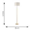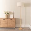 - Light wooden stem floor lamp with a natural colour linen drum shade with a white trim