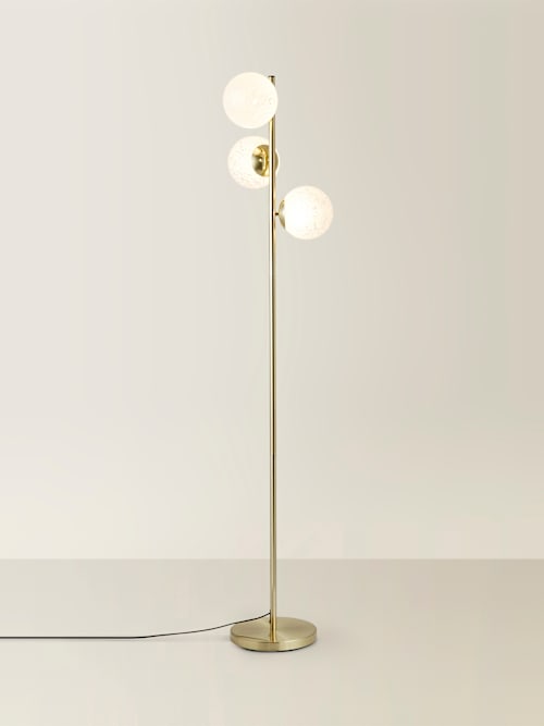 Pump up the glam with the Jas brushed gold floor lamp! With 3 confetti glass globes, it's bursting with charm and ready to dazzle. That brushed gold finish? Maximum drama. Mix and match with the Jas or India ranges to create your own lighting masterpiece. Whether it's lighting up your lounge or jazzing up your hallway, Jas brings the fun and flair in every flick of the switch. Just pop in 3 G9 bulbs to get glowing.