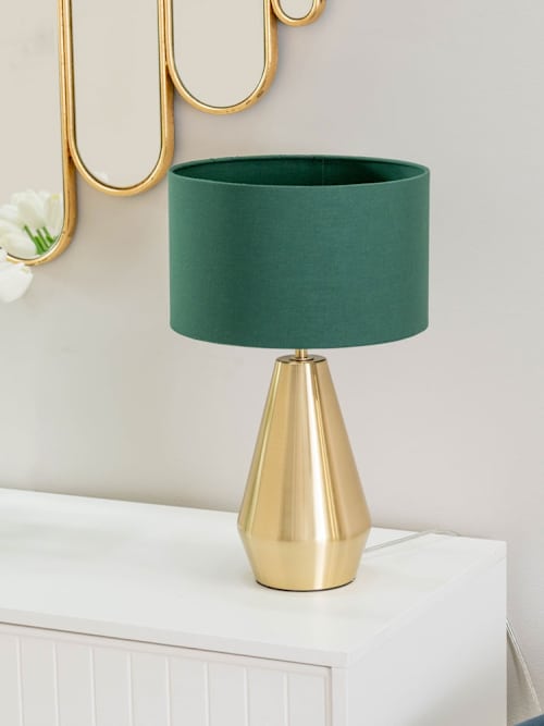 The jax touch table lamp in antique brass has a tapered base in an all over antique brass finish. The touch on/off technology makes it the most convenient option for side tables or bedsides, no more looking for switches, just reach out and touch it. We've paired jax with the forest green shade. A metal lamp base with touch on/off technology. Features a 15 cm cable. Finished with a fabric shade. Don't give up on style for function. The tapered antique brass base is the perfect starting point to mix this forest green drum shade with. Make a statement with all that space. Ideal for turning an empy side table into a moment. Best in living rooms, hallways and bedrooms. Requires 1x e27 bulb,