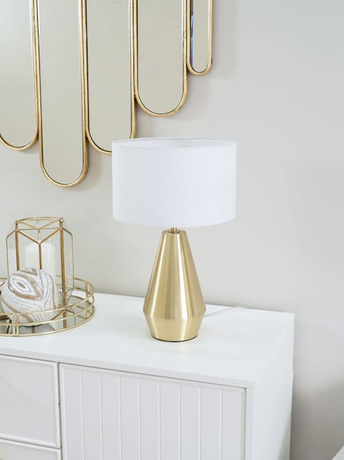 The jax touch table lamp in antique brass has a tapered base in an all over antique brass finish. The touch on/off technology makes it the most convenient option for side tables or bedsides, no more looking for switches, just reach out and touch it. We've paired jax with the black shade. A metal lamp base with touch on/off technology. Features a 15 cm cable. Finished with a fabric shade. Don't give up on style for function. The tapered antique brass base is the perfect starting point to mix this white drum shade with. Make a statement with all that space. Ideal for turning an empy side table into a moment. Best in living rooms, hallways and bedrooms. Requires 1x e27 bulb, personalise your