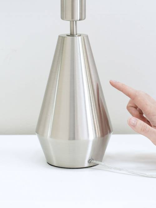 The jax touch table lamp in chrome has a tapered base in an all over antique brass finish. The touch on/off technology makes it the most convenient option for side tables or bedsides, no more looking for switches, just reach out and touch it. We've paired jax with the charcoal boucle shade. A metal lamp base with touch on/off technology. Features a 15 cm cable. Finished with a boucle shade. Don't give up on style for function. The tapered chrome base is the perfect starting point to mix this charcoal boucle drum shade with. Make a statement with all that space. Ideal for turning an empy side table into a moment. Best in living rooms, hallways and bedrooms. Requires 1x e27 bulb, personalise
