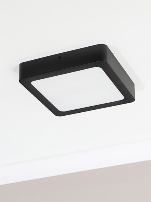 Sleek and modern, this square light can either be installed flush or recessed for a seamless, matte black look. Integrated LED. Call the electrician, this one needs hardwiring (24W, they'll know what that means.). Dimensions: Width 4.1cm, Height 22.5cm, Depth 22.5cm. Warm yet bright light. IP44 rated, perfectly resistant to the steamy nature of a bathroom. Class II IEC protection.