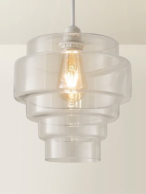 Meet Lane, the 5-tier clear glass pendant light shade that's a showstopper in any room! With five stunning tiers of glass, it's like a chandelier, but cooler and more stylish. Lane's clear glass design lets light shine through beautifully, creating a soft, glowing effect that'll have your space feeling luminous and luxe. Perfect for making a statement, Lane is here to light up your life - one tier at a time. Let's just say, it's lighting with layers of fabulousness! Our shades come with a 4cm opening for E27 lamp holders, and we’ve added a handy reducer ring that brings it down to 3cm so it’s E14 friendly too.