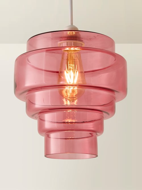 Meet Lane, the 5-tier pink glass pendant light that's a showstopper in any room! With five stunning tiers of pink glass, it's like a chandelier, but with a soft, feminine twist. Lane's pink glass design lets light filter through beautifully, creating a warm, glowing effect that'll have your space feeling luminous and luxe. Perfect for making a statement, Lane is here to light up your life - one tier at a time. Let's just say, it's lighting with layers of fabulousness! Our shades come with a 4cm opening for E27 lamp holders, and we’ve added a handy reducer ring that brings it down to 3cm so it’s E14 friendly too.