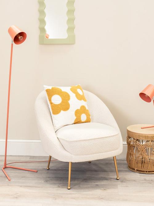 The lark dome shade floor lamp in coral injects a pop of colour wherever you place it. Cute, colourful and full of charm, this standing lamp is there for you whether you want to liven up your workspace, highlight your hobbies, or add vibrance to a dreary corner. Painted in a stylish coral, it can be the ideal accent in a matching colour scheme. But dont be scared to colour clash too! A coral painted metal floor lamp with distinctive pronged feet. Features a foot switch on a 18cm cable. A modern, streamline, all in one base and domed shade design in coral. A pronged footed base and slim stem. A versatile piece well suited throughout the home. Perfect in living rooms, hallways, bedrooms and