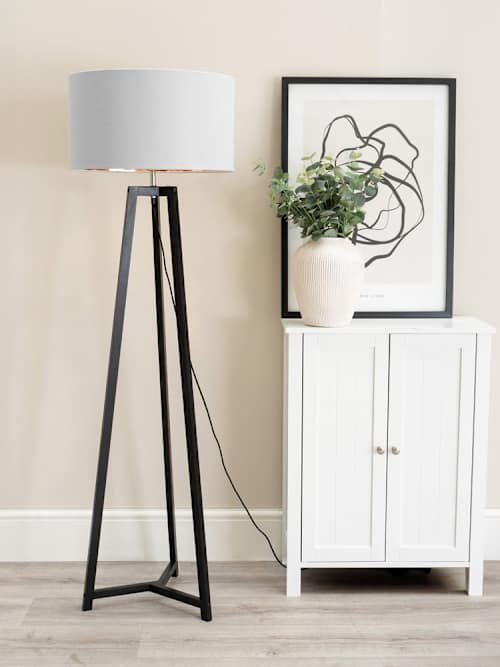 Good things come in threes and the Lottie tripod floor lamp has three legs! With a black wooden finish, this sleek and stylish floor lamp is topped with a grey and gold drum shade. Leggy and en vogue, this lamp is runway ready! There’s a generous 3m long cable from plug to lamp too, so you have flexibility in where you place this bright beauty.