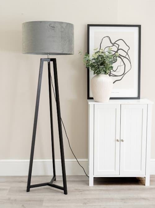 Lottie Black Tripod Floor Lamp with Grey Velvet Shade