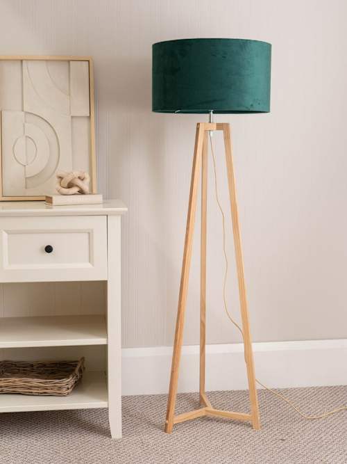 Lottie Natural Wood Tripod Floor Lamp with Forest Green Velvet Shade