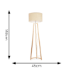 - A three legged floor lamp base in a natural wood with a contemporary structure with a fabric shade. Features a foot switch on a 300cm cable.