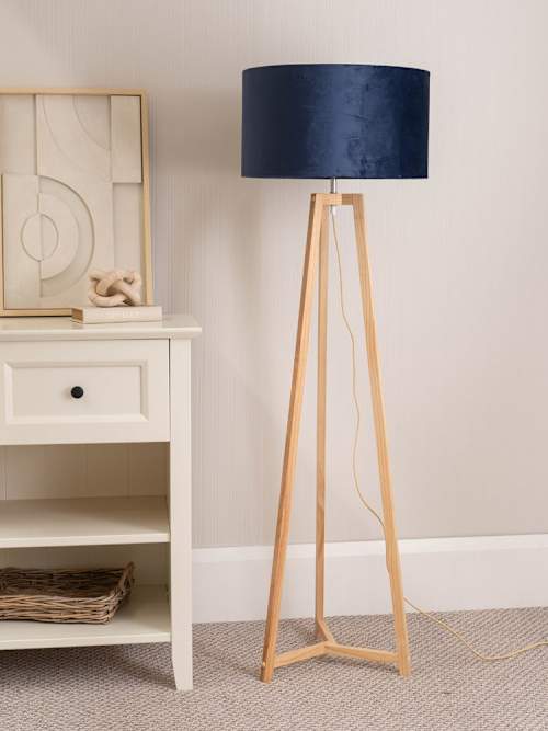 Lottie Natural Wood Tripod Floor Lamp with Navy Velvet Shade