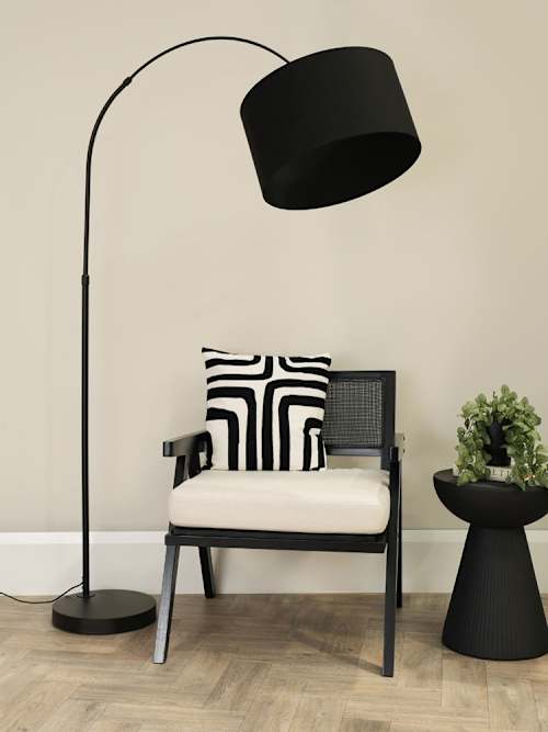 The Louis arch floor lamp in black is a modern twist on a vintage classic, paired with a black drum shade. Designed to slot behind or beside sofas, the arch style brings overhead light to tight corners. Features a foot switch on a 200cm cable. Requires 1x E27 bulb, max 10W. Plug in and enjoy a stylish, functional glow in any living space.