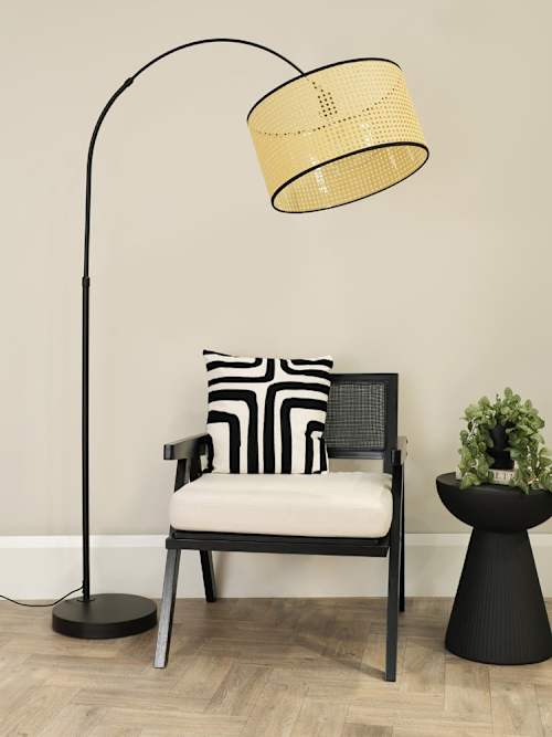 The Louis arch floor lamp in black is a modern take on a vintage classic. Perfect for reading lights, slotting beside or behind sofas so the light hangs overhead. Paired with a black trim cane drum shade. A standalone metal arch floor lamp base, with a cane shade. Featuring a foot switch on a convenient 200cm cable. An iconic arch floor lamp style in a modern black colourway. Paired with a trendy black trim cane shade. Fits perfectly behind or beside a sofa to hang overhead or over side tables. A stylish touch to any tight corner.