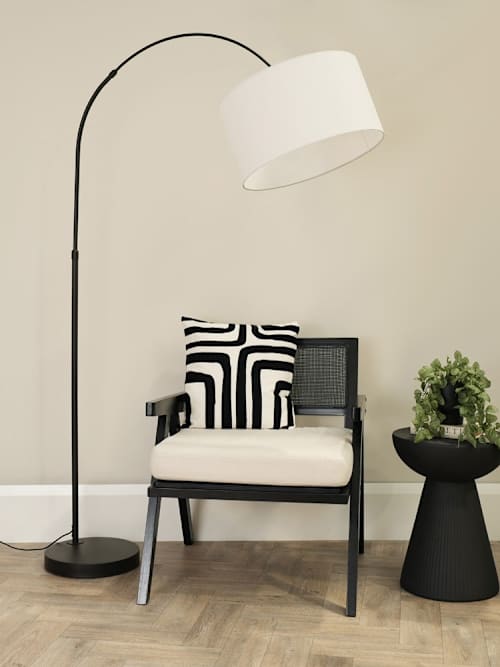 The louis arch floor lamp in black is a modern take on a vintage classic. Perfect for reading lights, slotting beside or behind sofas so the light hangs overhead. Paired with a natural drum shade. A standalone metal arch floor lamp base, with a drum shade. Featuring a foot switch on a convenient 2cm cable. An iconic arch floor lamp style in a modern black colourway. Paired with a fabric drum shade in white. Fits perfectly behind or beside a sofa to hang over head, over side tables. A stylish touch to any tight corner. Requires 1x e27 bulb, max 1w. Personalise the lighting experience with your choice of cool, natural, warm or smart bulb. Doesn't require installation, just plug into any uk