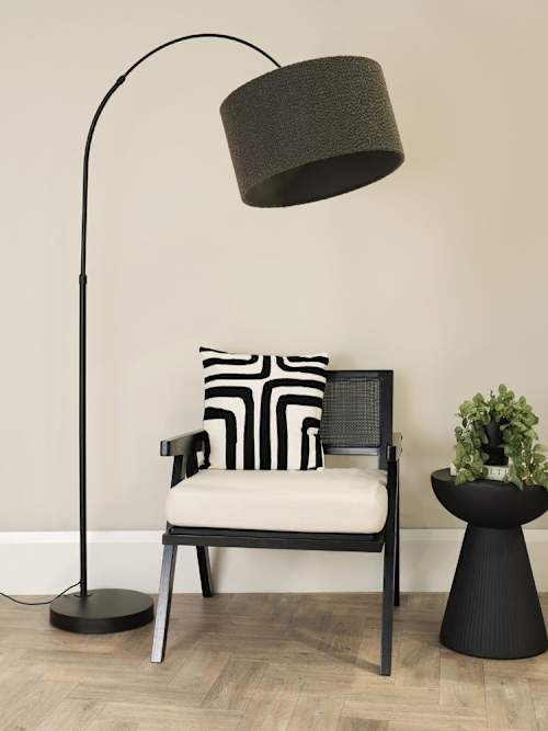 The Louis arch floor lamp in black is a modern take on a vintage classic. Perfect for reading lights, slotting beside or behind sofas so the light hangs overhead. Paired with a charcoal boucle drum shade. A standalone metal arch floor lamp base, with a drum shade. Featuring a foot switch on a convenient 2cm cable. An iconic arch floor lamp style in a modern black colourway. Paired with a charcoal coloured boucle drum shade. Fits perfectly behind or beside a sofa to hang over head, over side tables. A stylish touch to any tight corner. Requires 1x E27 bulb, max 1W. Personalise the lighting experience with your choice of cool, natural, warm or smart bulb.