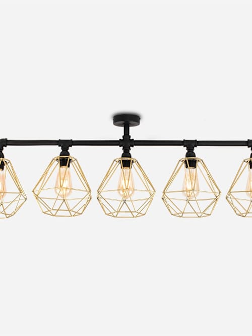 Bring bold industrial vibes to your home with the Luiggi 5-way bar ceiling light. With a striking black finish and five standout gold cage shades, it's perfect for adding character to kitchens, dining areas, or living rooms. Just add your favourite E27 bulbs and let it light up your space with serious style. Whether you're going for modern loft or vintage factory feels, this standout piece is sure to steal the spotlight. It's lighting that means business, with a playful twist!