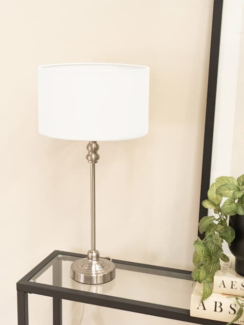 The perfect foundation for any shade. The maggie candlestick table lamp in brushed chrome is an understated, slim table lamp base perfect for tighter spaces and ready to glow with this white drum shade. A free standing table lamp with a slim stem and a wide base. Fitted with a rocker switch on a convenient 15cm cable and finished with a shade. Simple, elegant and contemporary. A simple bruswhed chrome base matched with a classic fabric drum shade in a white colourway. A slim design that fits well in tight spots, suitable for living rooms, bedrooms, hallways, dining rooms, kitchens and home offices. Requires 1x bulb, max 7w. Personalise the lighting experience with your choice of cool,