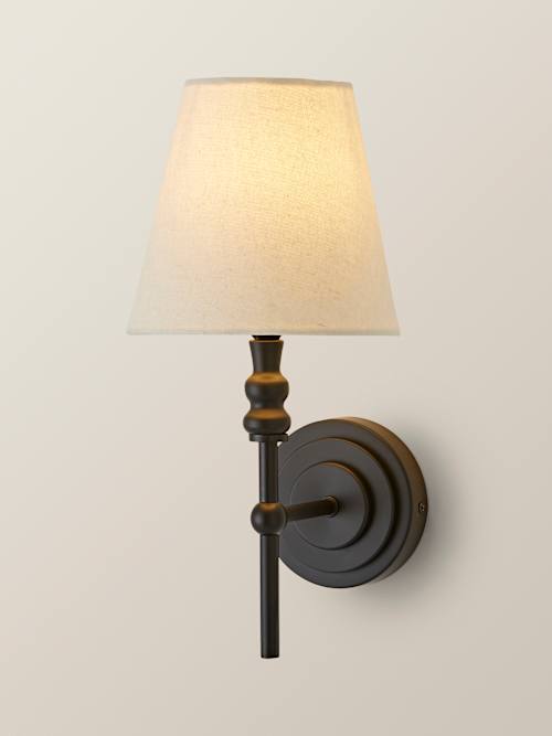 The Maggie matte black wall light is your shortcut to instant glam! With a tapered linen finish shade and a sleek style, it's serving elegance with a side of sass. Available in brushed chrome and brushed gold too, Maggie's got options! Want to dial up the drama? Pair it with matching table and floor lamps for a layered lighting look that's totally fabulous. Chic, playful, and ready to shine, this wall light is a glow-up for your walls!